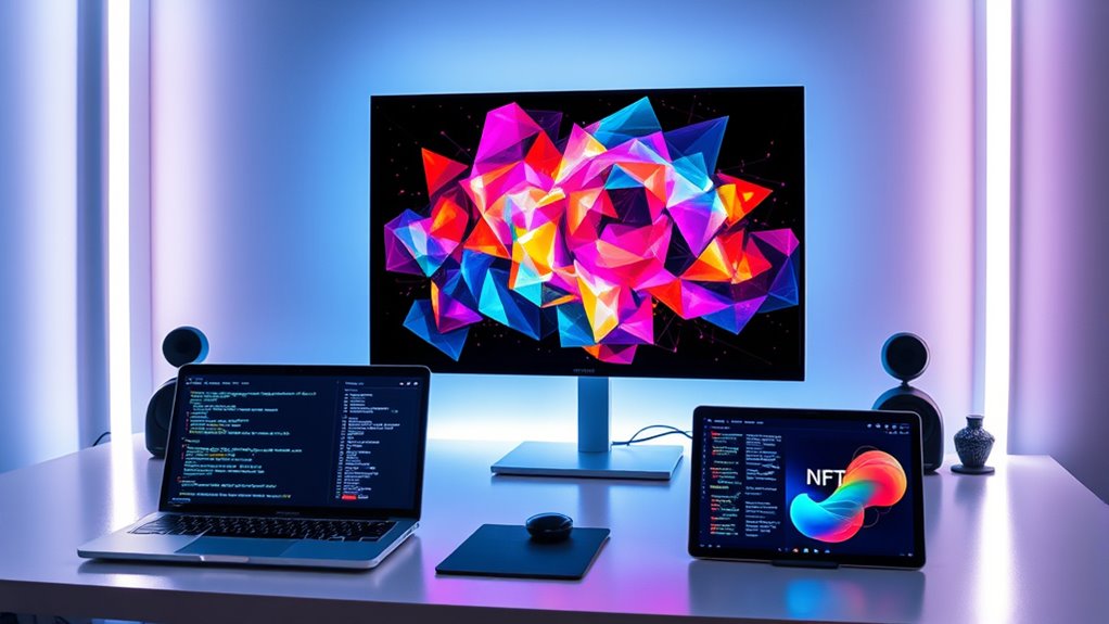 Have you ever wondered how artificial intelligence is revolutionizing the world of digital art? It’s a fascinating shift, especially when you consider how AI is enabling the creation of unique, intricate pieces through generative art. Instead of manually designing every detail, artists and developers harness algorithms that produce endless variations, giving birth to truly one-of-a-kind visuals. This process isn’t just about making pretty images; it’s about pushing creative boundaries and exploring new ways to express ideas. When you immerse yourself in AI-generated NFT collections, you’re witnessing a blend of human ingenuity and machine precision, creating art that’s as unpredictable as it is beautiful. Additionally, advances in color accuracy ensure that the vibrant details of these generative pieces are rendered faithfully across digital platforms. Blockchain integration plays a critical role in this evolution. When AI-generated art becomes an NFT, it’s stored securely on a blockchain, ensuring provenance, authenticity, and ownership are transparent and immutable. This means that every piece you acquire or create has a verified history, which is essential in the digital art market’s fast-paced environment. Blockchain technology also facilitates seamless transactions, allowing collectors to buy, sell, or trade NFTs with confidence. It’s a system that safeguards artists’ rights, prevents forgery, and makes the entire process more accessible and trustworthy. As you explore AI-generated NFT collections, you’ll notice how blockchain integration enhances the value and appeal of these digital assets. Unlike traditional art, which relies on physical presence or limited reproduction, NFTs are unique tokens that represent a specific piece of generative art. This uniqueness is validated on the blockchain, making each NFT a collectible with real-world significance. The combination of generative art and blockchain technology doesn’t just democratize art ownership; it also opens up new avenues for artists to monetize their work and reach global audiences without traditional gallery constraints. Furthermore, the synergy between AI, generative art, and blockchain is fostering innovative collaborations. Artists can experiment with complex algorithms, producing art that evolves or responds to external data, and then secure their creations as NFTs. This process allows for dynamic, living artworks that are both technically impressive and culturally relevant. The transparency and security provided by blockchain give collectors confidence in the authenticity and rarity of these pieces, reinforcing their value in a rapidly evolving digital landscape. In essence, AI-generated NFT collections stand at the crossroads of creativity and technology. They challenge conventional notions of art, ownership, and value, empowering creators and collectors alike. By harnessing generative art and integrating it with blockchain, you’re witnessing a new era where imagination meets code, transforming how digital art is conceived, bought, and appreciated.