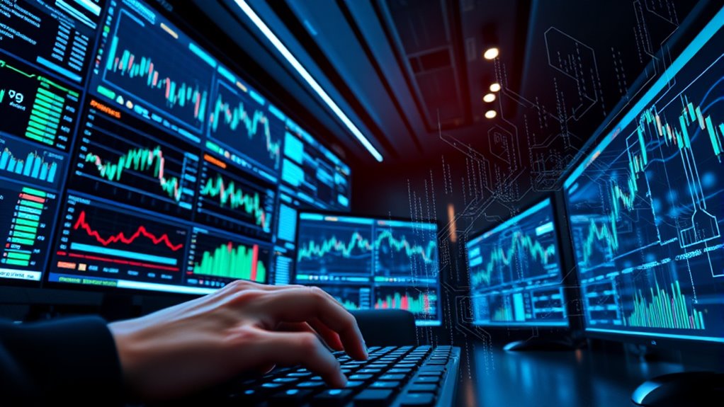 When you use AI trading bots, you face risks like market manipulation, where bots might unintentionally influence prices or be exploited for malicious purposes. Cybersecurity threats also pose a danger, as hackers can access your accounts or disrupt trading operations. These risks can lead to significant financial losses or legal issues, so it’s essential to stay vigilant, use secure platforms, and understand the potential dangers before relying on AI trading bots.
