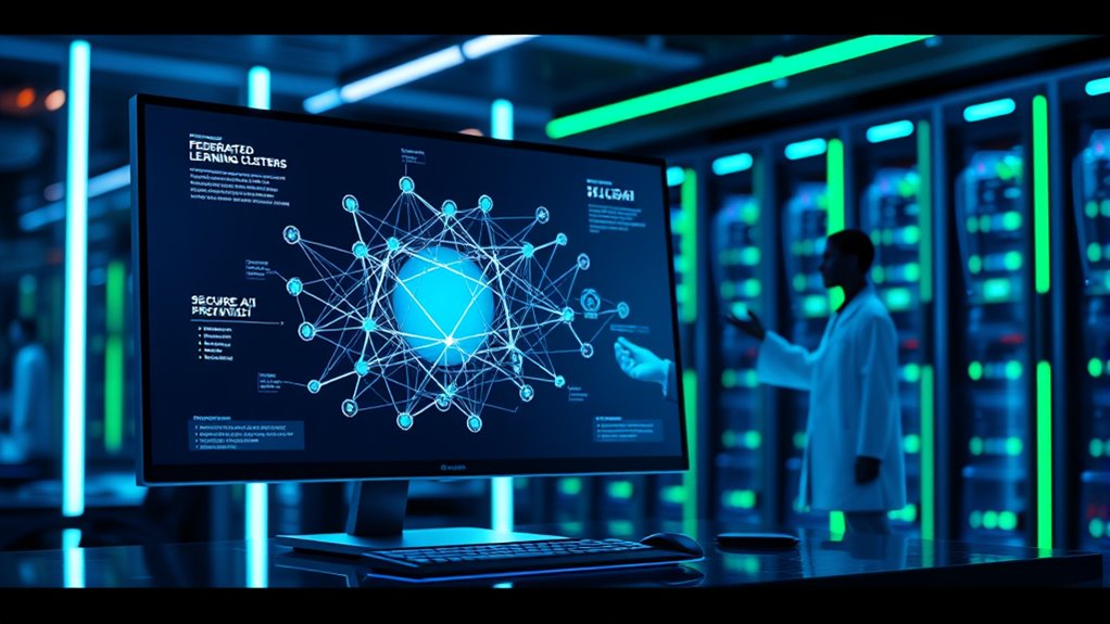 By combining federated learning with blockchain, you can enhance privacy and security in AI development. This approach lets you train models collaboratively without exposing sensitive data, thanks to blockchain’s transparency and decentralization. It guarantees trustworthiness and tamper resistance, making your AI solutions more robust. Embracing this synergy helps you create privacy-preserving, scalable, and reliable AI systems that can thrive in a secure, distributed environment.