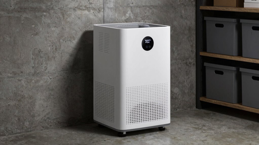 A 70-pint dehumidifier isn’t ideal for cold temperature operation, especially in extremely cold environments. It can struggle to function properly, leading to reduced efficiency or damage. To guarantee peak performance, you should carefully consider dehumidifier placement—avoid areas with freezing temperatures. If you need dehumidification in cold spaces, look for models specifically designed for cold temperature operation to prevent issues like freezing or mechanical failure.