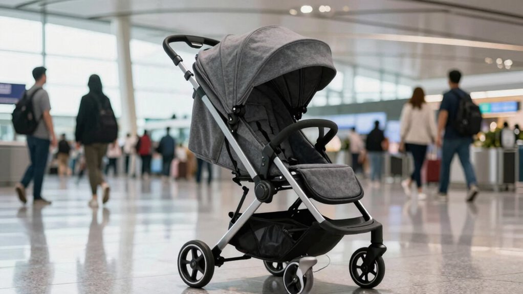 When maneuvering busy airports or making quick stops, lightweight strollers become essential for effortless mobility. They’re perfect for navigating crowded terminals and tight spaces without hassle. Look for strollers that are easy to fold with one hand, making airport security checks and gate changes smoother. Imagine gliding through the terminal with a stroller that’s compact enough to store in overhead bins or under seats. Visualize adding stroller accessories like cup holders, sun shades, or storage pockets to customize your experience. Consider strollers with: