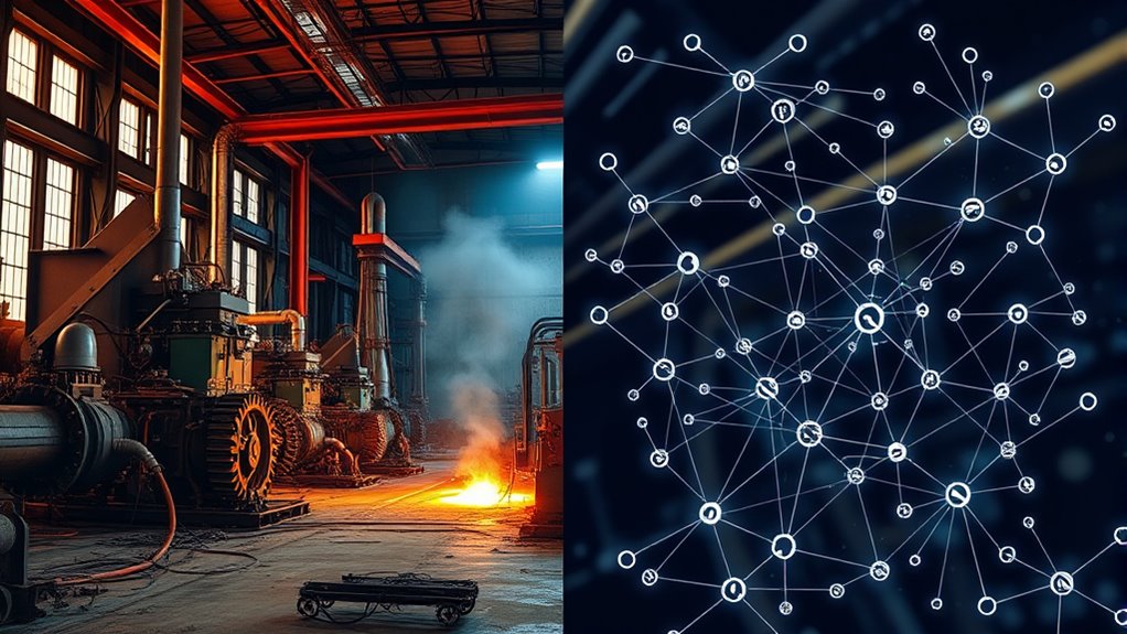 Proof of Work (PoW) requires miners to solve complex puzzles to validate transactions, consuming a lot of energy and demanding powerful hardware. In contrast, Proof of Stake (PoS) selects validators based on their staked assets, using much less energy and allowing broader participation. PoW offers strong security but can be less sustainable, while PoS promotes efficiency and scalability. If you want to understand how these mechanisms impact networks and sustainability, keep exploring the differences.