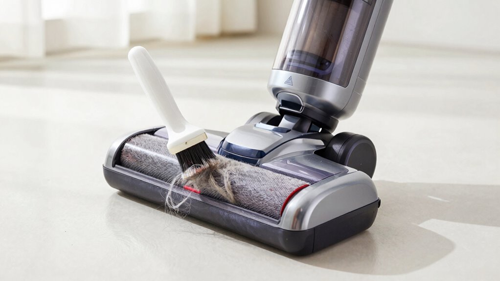 Did you know that regular brush roll maintenance can reduce pet hair buildup by up to 60%? To prevent pet hair from sticking, regularly clean the brush roll with a comb or scissors to remove debris. Use pet hair prevention tools like rubber gloves or a lint roller on the brush. This keeps your vacuum’s brush roll clean, ensuring peak performance and easier brush roll maintenance over time.