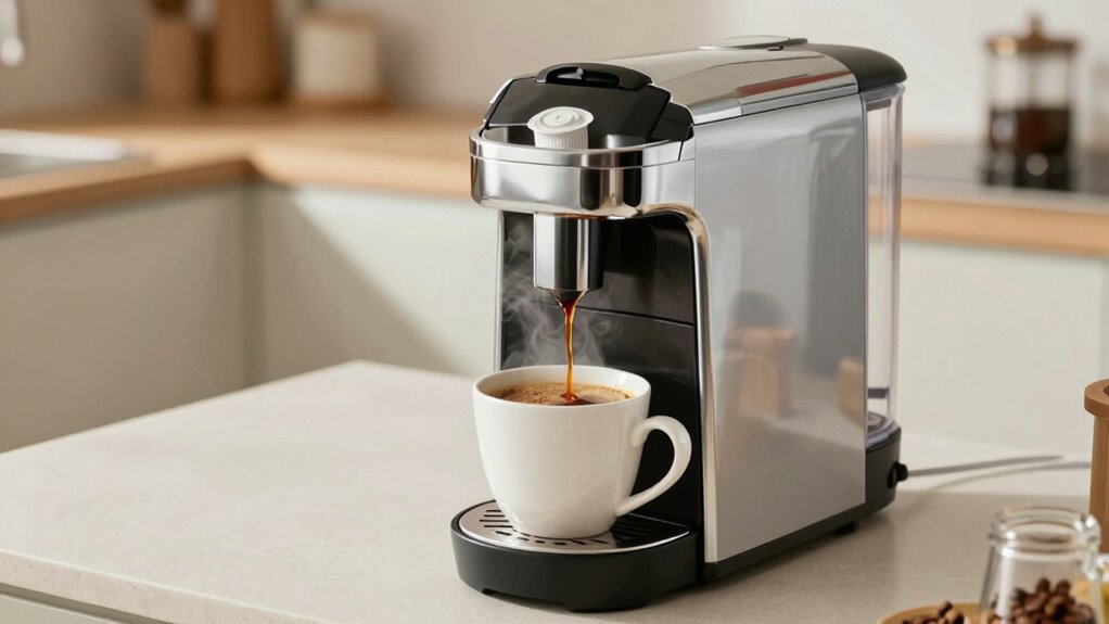 To achieve a richer, more flavorful cup from your single-serve coffee maker, you can adjust its settings to enhance the brew strength. Start by exploring your machine’s calibration options to guarantee it brews at ideal parameters. Increasing the brew strength setting allows more coffee to extract, resulting in a bolder flavor. Additionally, understanding your machine’s safe installation practices can prevent damage and ensure consistent performance. Consider these adjustments: – Modify the brew strength setting for a thicker, more intense flavor. – Use a stronger brew cycle if available. – Adjust the water-to-coffee ratio for a more concentrated brew. – Calibrate your machine periodically to maintain consistent strength. – Experiment with different pod types to find your preferred intensity. These tweaks help you customize your coffee’s richness, making each cup more satisfying.