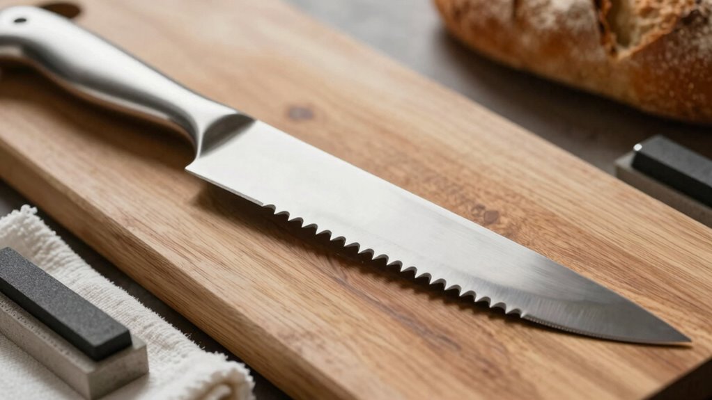 To keep your bread knife sharp and cutting effortlessly, regular maintenance is essential. Proper sharpening techniques restore the blade’s edge, ensuring smooth slices through various cutting surfaces. To maintain performance, consider these tips: