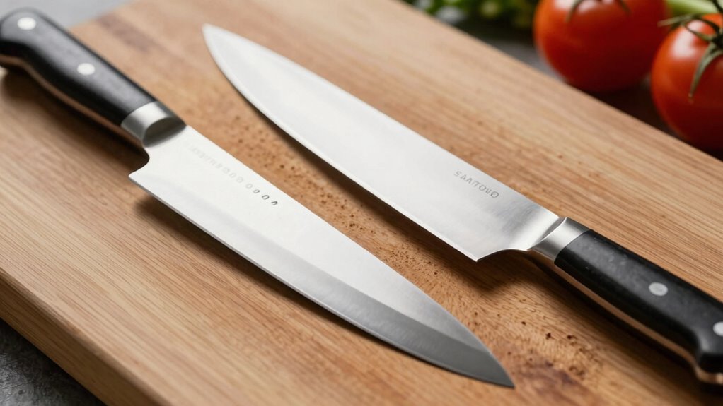 The blade profiles of Gyuto and Santoku knives reflect their distinct culinary purposes, with each design influencing how they handle different tasks. Gyuto blades typically feature a gentle curve along their length, allowing for a rocking motion that’s ideal for slicing and chopping. Their longer blade length provides leverage and precision for larger cuts. In contrast, Santoku knives usually have a flatter profile with a more subtle curve, creating a shearing action perfect for slicing vegetables and fish. The knife edge on a Gyuto often extends from tip to heel with a slight upward curve, while the Santoku’s edge tends to be straighter, offering more control. These differences in blade profile and curvature directly impact your cutting style and efficiency in the kitchen.