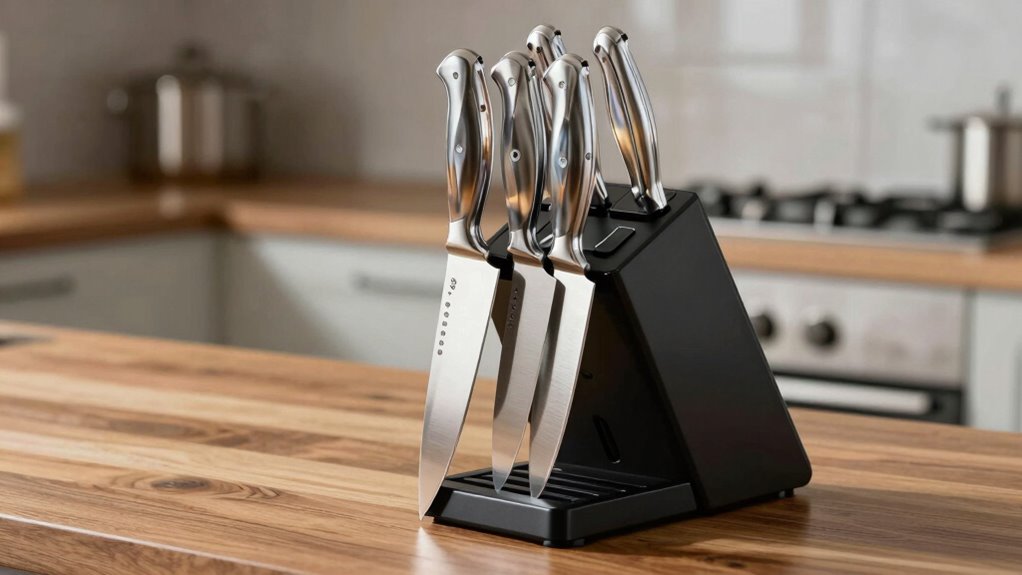 Choosing the right knife set is like planting a reliable garden—you’ll nurture it with care, ensuring every blade stays sharp and ready. By understanding steel types, tang myths, and safe storage, you’re equipping yourself with tools that cut through hesitation and clutter. Think of your knives as trusted companions on your culinary journey—sharper, safer, and more beautiful with every use. With the right care, your kitchen will shine like a well-tended orchard in full bloom.