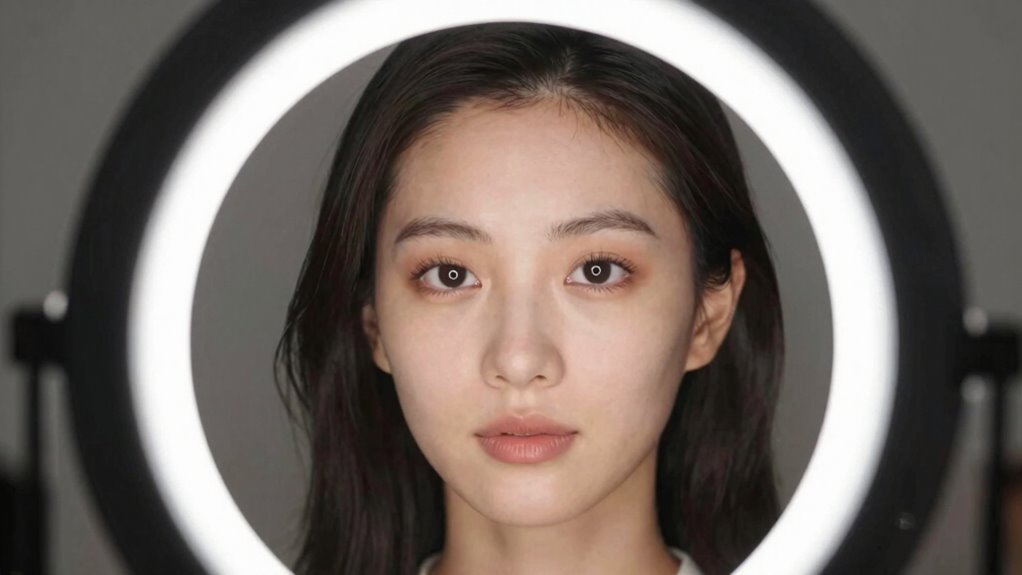 To flatter an oval face with a ring light, adjusting the angle is key. Since oval faces are well-balanced and showcase natural symmetry, you can experiment with slight shifts to enhance your features. Position the ring light slightly above eye level to highlight your face’s symmetry while softening shadows. Modify the lighting color to complement your skin tone and add warmth or coolness as needed. Proper lighting angles are essential for achieving a natural and flattering look, especially when aiming to reduce harsh shadows. Consider these adjustments: