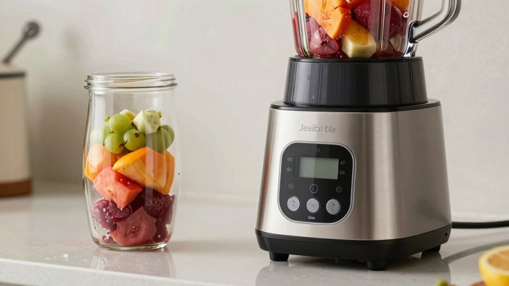 Looking to boost your blending experience? Extra features like smart controls and Bluetooth connectivity can make a considerable difference. Smart controls let you pre-program blending cycles or adjust settings with ease, saving you time and effort. Bluetooth connectivity enables you to sync your blender with your smartphone or tablet, giving you remote control and access to custom recipes. These features add convenience, allowing you to adjust blending speed, monitor progress, or start your blender from across the room. They also help you keep your device updated with software enhancements. Incorporating wireless connectivity can further streamline your kitchen tasks and improve your overall experience. Additionally, software updates ensure your device remains current with the latest features and security improvements. Ensuring your blender has long-term software support can help prevent obsolescence and maintain optimal performance over time. Considering home automation integration can make your kitchen even smarter and more responsive. While these extras might come at a higher price, they significantly enhance usability and modernize your kitchen. If you want a more connected, effortless blending experience, look for blenders with smart controls and Bluetooth capabilities. Smart home integration can further enhance your kitchen by enabling seamless automation and control of your appliances.