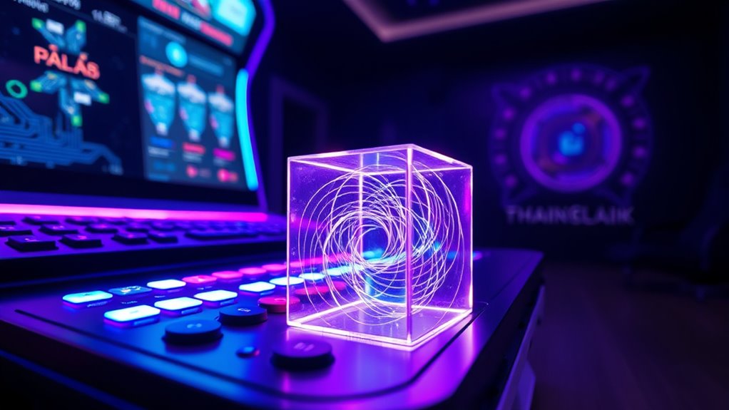 Chainlink VRF powers gaming by providing cryptographically secure, verifiable randomness that guarantees outcomes are fair and tamper-proof. It operates through a decentralized network, meaning no single entity can manipulate results. When a game needs randomness, VRF generates a cryptographic proof that anyone can verify, increasing transparency and trust. This system aligns with the principles of provably fair gaming, allowing you to trust the fairness of results. Keep exploring to understand how this technology enhances your gaming experience.