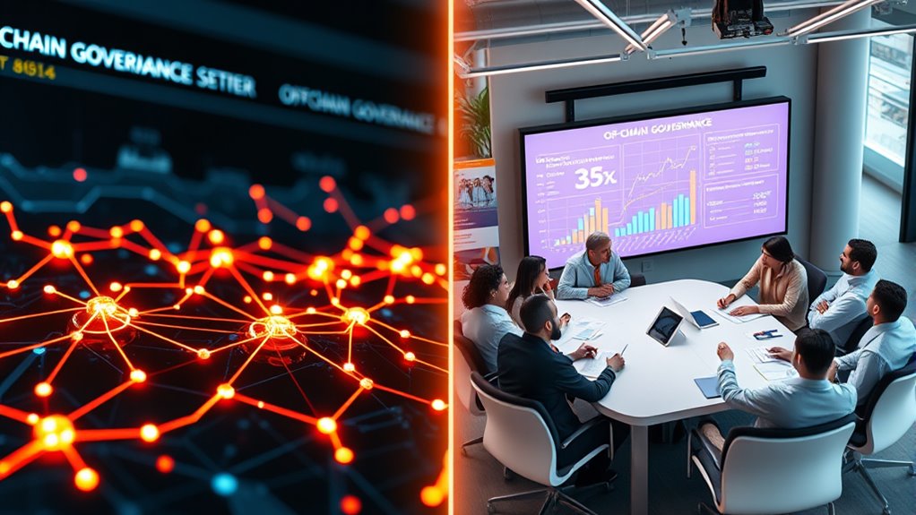 On-chain governance lets you influence decisions directly through mechanisms like token voting and smart contracts, promoting transparency and decentralization. Off-chain governance relies on community discussions, forums, and consensus outside the blockchain, offering flexibility and nuanced debate. While on-chain systems provide efficiency and clear transparency, off-chain approaches can be more adaptable to changing needs. Understanding these methods helps you grasp how projects balance community involvement and decision legitimacy—exploring these differences reveals how crypto projects shape their futures.