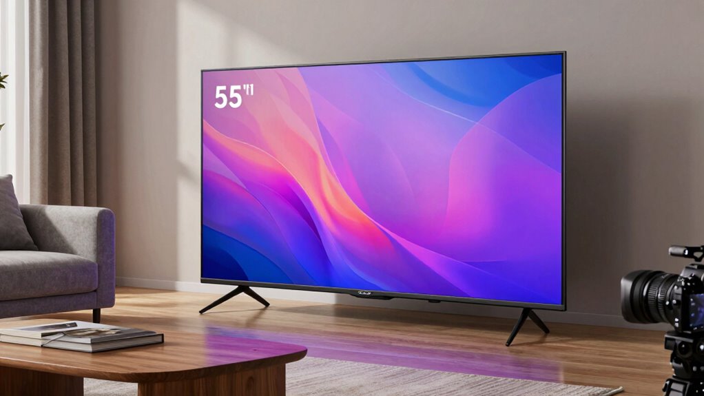 By following the right viewing distance, you’ll enjoy your 55-inch TV like a movie theater experience right in your living room. Think of it as finding the perfect dance partner—too close or too far, and the magic’s lost. Adjust your seating, avoid common mistakes, and stay mindful of your eye comfort. With these tips, your home viewing will become as enjoyable and immersive as watching your favorite film unfold before your eyes.