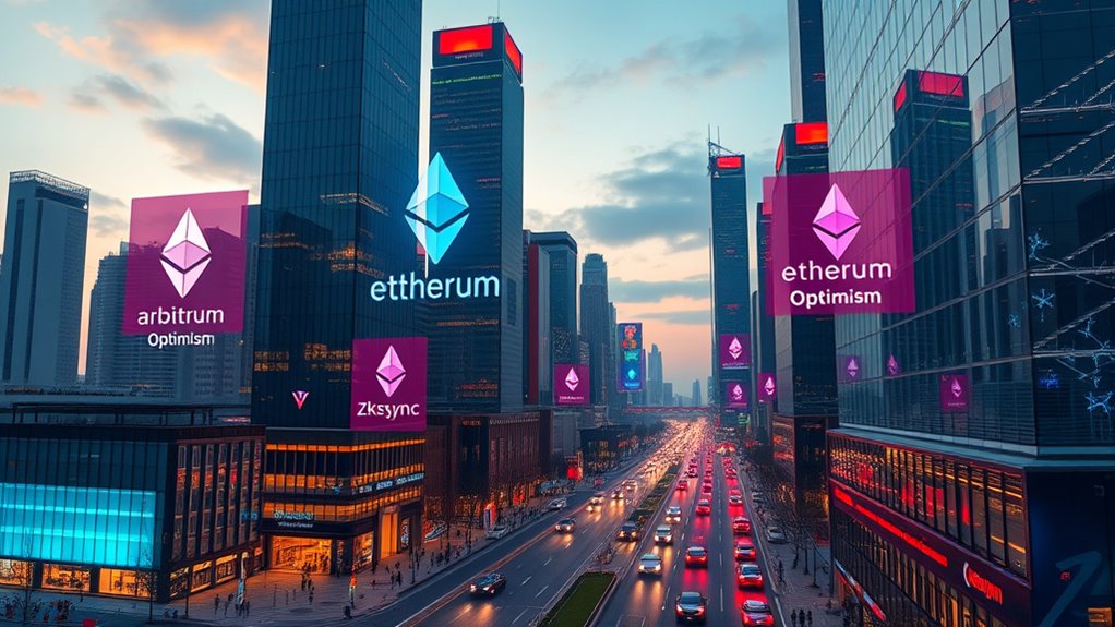 By 2025, Ethereum’s Layer-2 solutions like Arbitrum, Optimism, and ZkSync have markedly boosted the network’s scalability and user experience. You’ll find faster, cheaper transactions with less congestion, making crypto more accessible. Arbitrum leads with high adoption, while Optimism focuses on seamless DeFi integration. ZkSync emphasizes security and privacy, appealing to sensitive users. If you keep exploring, you’ll discover how these advancements continue to shape Ethereum’s future.