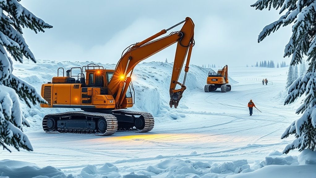 Your mining equipment faces harsh challenges from Siberia’s extreme cold, which can cause materials to become brittle and increase wear and tear. To keep your operations running smoothly, you need diligent equipment maintenance and effective climate adaptation strategies. Proper insulation, heating systems, and regular checks help prevent breakdowns. By addressing these cold-related issues proactively, you guarantee your equipment remains durable and reliable despite the severe Siberian climate.