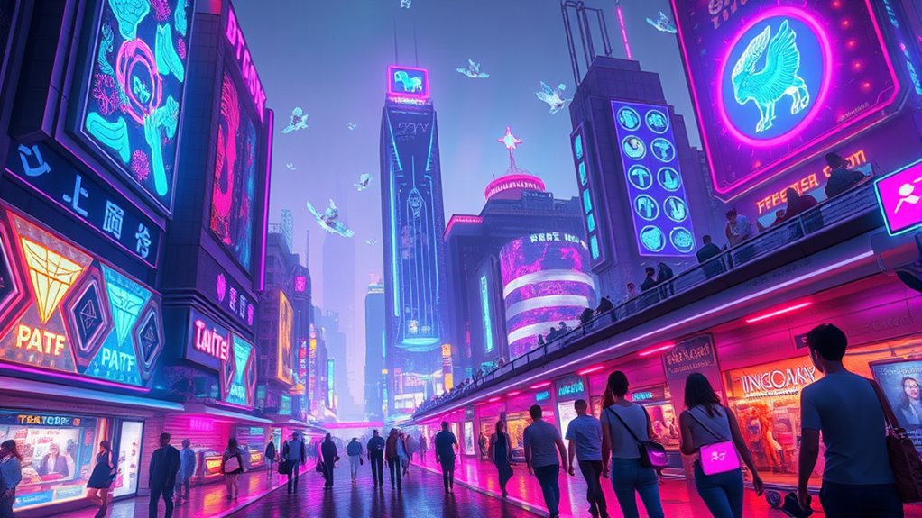 Digital collectibles and NFTs are transforming virtual worlds by creating lively economies where you can buy, sell, and trade unique assets. These items boost your personalization, status, and engagement within digital environments. Blockchain guarantees authenticity and rarity, increasing their value. Augmented reality integrates digital assets into your real surroundings, making them more tangible. As virtual markets grow, your participation becomes more immersive and dynamic—exploring these trends further will reveal how they shape the future of digital worlds.