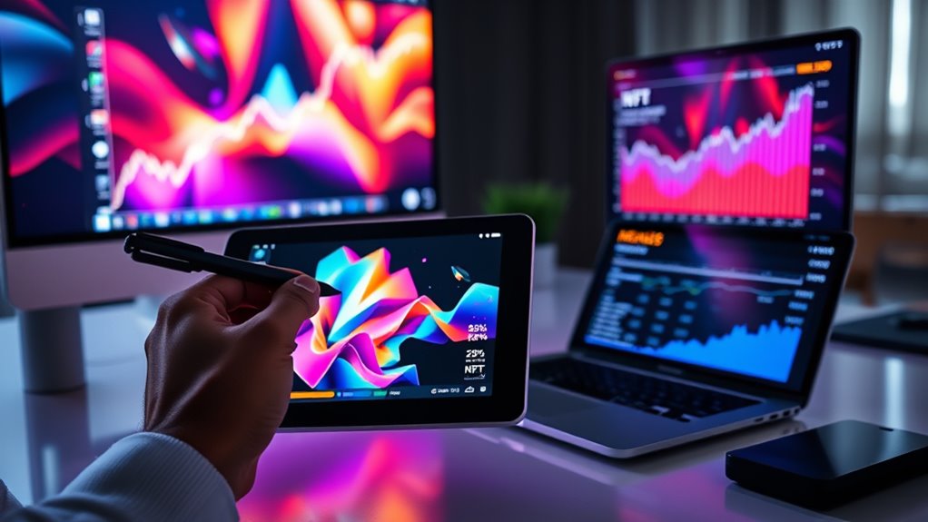 You might wonder if NFT royalties are sustainable long-term or just a passing trend. While market stability varies, many creators rely on royalties for ongoing earnings. As blockchain standards evolve, they can help safeguard creator earnings and guarantee more consistent royalty payments. However, the future depends on broader adoption and community support. If these factors align, NFT royalties could become a stable source of income rather than just a fleeting opportunity.