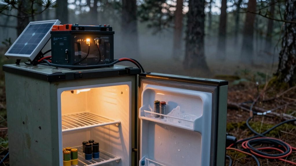 Imagine waking up at dawn, only to find your batteries drained overnight, just like a forgotten campfire smoldering quietly out of sight. That power draw mistake sneaks up on you, turning your camping fridge/freezer into a silent battery killer. Stay vigilant, monitor your energy use, and prevent that coincidence from ruining your trip. When you keep an eye on your power, your adventure stays smooth, and your batteries keep going strong, night after night.