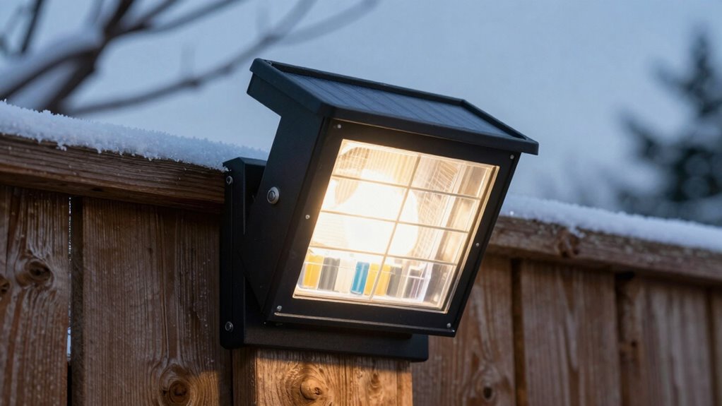 Winter can be tough on your solar outdoor lights, but there are steps you can take to guarantee they stay bright and functional. First, optimize your solar panel orientation by angling it to maximize sunlight exposure, even in low winter sun angles. Clear any snow or debris from the panel to ensure it absorbs as much light as possible. Additionally, consider the winter light duration — shorter days mean your lights need sufficient charge time. Installing the lights in a spot that receives the most sunlight during winter hours can help extend their operation. You might also use lights with larger panels or higher-efficiency cells to gather more energy. These adjustments can considerably improve your solar lights’ winter performance and keep your outdoor space illuminated.