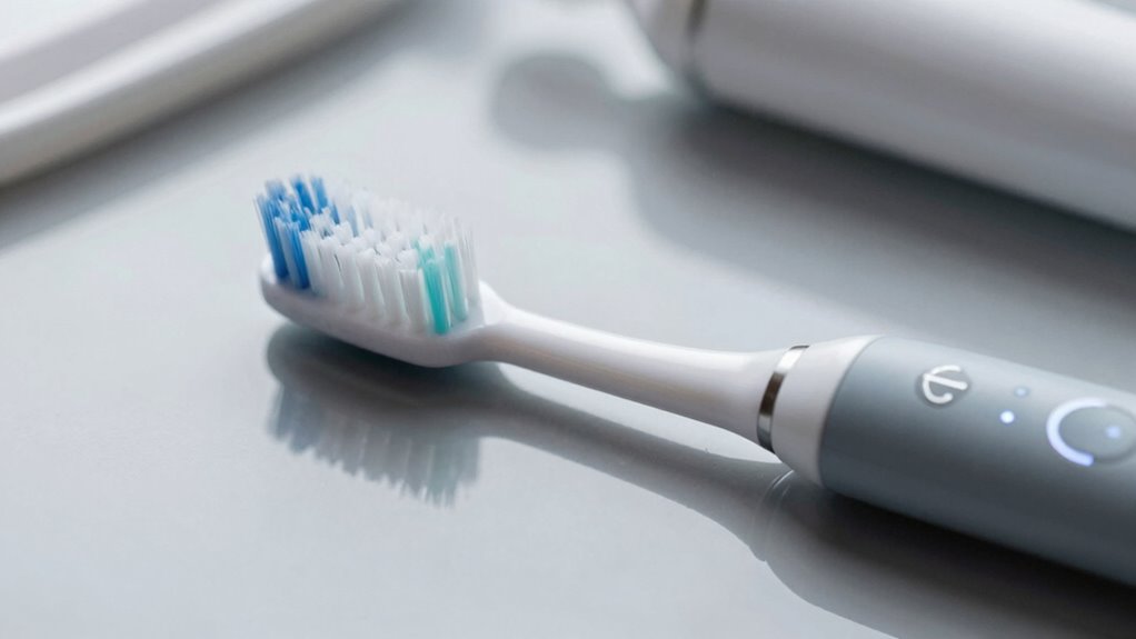 You should replace your electric toothbrush’s brush head every three months to maintain ideal cleanliness. This replacement schedule ensures you’re adhering to the recommended toothbrush lifespan, preventing bacteria buildup and maintaining effective brushing. If you notice the bristles fraying or splaying sooner, replace the head sooner. Regularly changing your brush head is a simple way to keep your oral hygiene routine effective and protect your dental health.