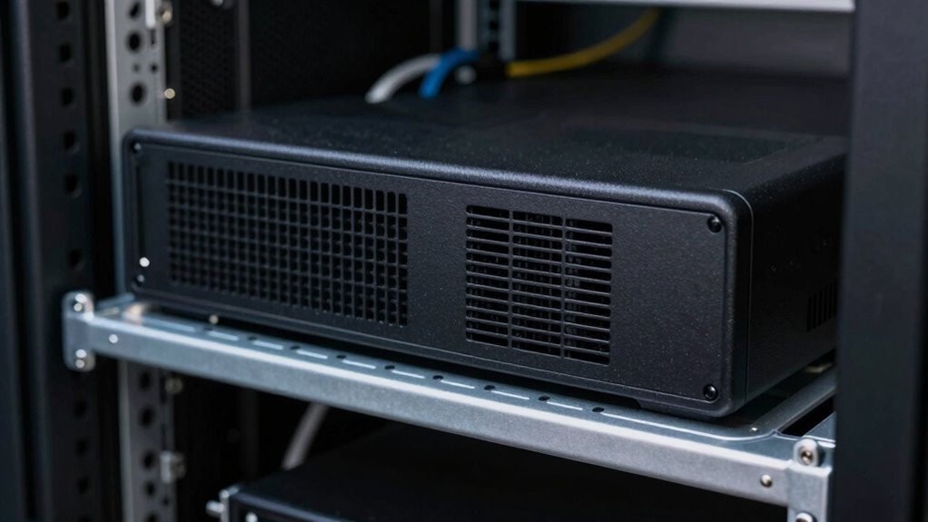Installing a rackmount UPS is a straightforward process that can substantially enhance your data center’s reliability. As you set it up, one key consideration is ensuring proper power distribution. A well-placed UPS not only supplies backup power but also helps balance your electrical load, preventing overloads and outages. When planning your installation, think about airflow and ventilation optimization. Proper ventilation prevents overheating, which can damage sensitive equipment and reduce the lifespan of your UPS. Make sure your rack has enough space around the unit for adequate airflow, and consider adding ventilation fans if necessary. Good airflow also helps dissipate heat generated during power surges or extended use, keeping everything running smoothly.