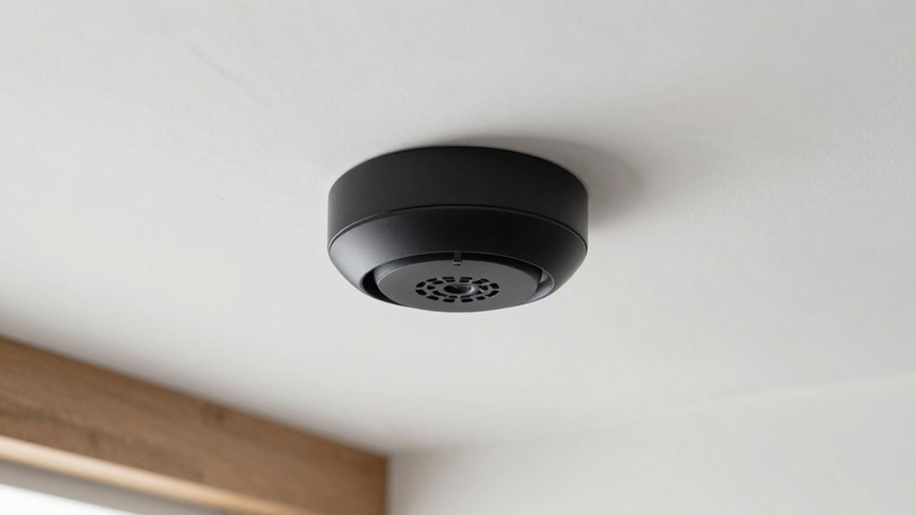Proper mounting height is essential to guarantee your smoke and CO detectors work effectively over time. You want them placed where they can detect smoke and gases quickly without disrupting your interior design or aesthetic considerations. Typically, smoke detectors should be mounted on the ceiling or high on the wall, about 4 to 12 inches below the ceiling, to maximize coverage. For CO detectors, placing them at chest level or on the wall about 5 feet above the floor ensures ideal detection. Keep in mind that the placement shouldn’t compromise your room’s aesthetic; choose locations that blend seamlessly with your decor. Proper mounting height ensures you get reliable alerts while maintaining the visual harmony of your space.
