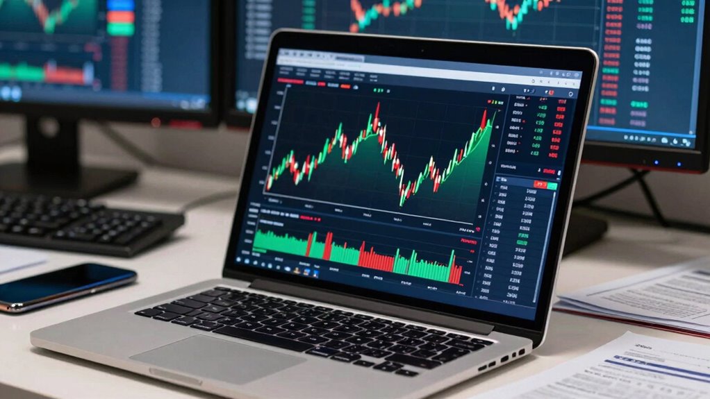 When selecting a day-trading laptop, the display quality matters more than the CPU because your ability to interpret charts, signals, and news depends on clear, accurate visuals. Look for a high-resolution, color-accurate screen with good brightness and contrast. A vibrant display helps you spot subtle shifts and make quick decisions, which can be more critical than raw processing power. Keep exploring to discover how to optimize your setup for peak trading performance.