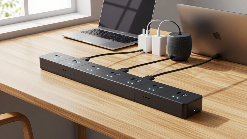 Like a conductor guiding an orchestra, smart power strips seamlessly integrate with home automation systems. You can easily connect them for efficient energy management, ensuring devices turn off when not in use. Most smart power strips are designed for device compatibility, making setup straightforward. This integration helps you reduce waste and optimize energy use, giving you smarter control over your entire home’s power consumption without hassle.