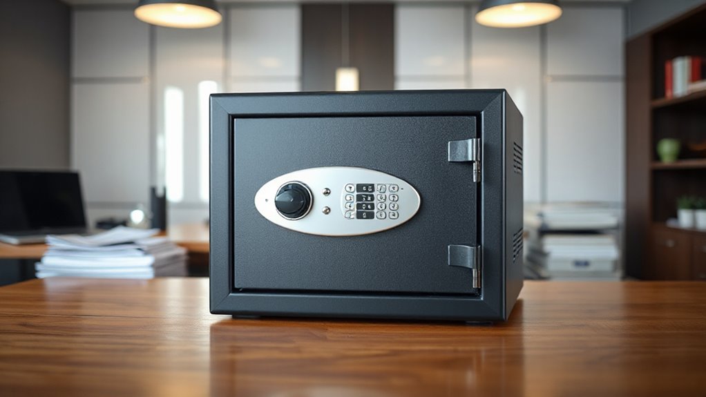 Selecting the right security locking features is key to ensuring your documents stay protected in a fireproof safe. I recommend choosing safes with high-security mechanisms like electronic keypads, combination locks, or mechanical keys. These offer reliable access control and peace of mind. Look for safes that include anti-theft measures such as pry-resistant bolts, drill-resistant plates, or reinforced hinge bars—these add extra layers of security. Dual-locking systems or secondary locks can further prevent unauthorized access. It’s also important that the locking mechanism is durable, made from high-quality materials resistant to tampering, forced entry, and wear over time. Ultimately, opt for user-friendly features like programmable codes or biometric authentication, which allow quick, secure access during emergencies while keeping your valuables safe.