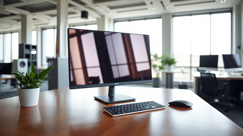 Choosing a monitor with eye comfort features is vital for maintaining productivity during long work sessions. Look for models with Flicker-Free technology, which eliminates screen flickering and helps reduce eye strain. A Blue Light Filter or Low Blue Light mode is also important, as it minimizes exposure to potentially harmful blue light, making extended use more comfortable. Monitors with Eye Saver Mode automatically adjust brightness and color temperature based on ambient lighting, further easing eye fatigue. Certifications like TÜV ensure the display adheres to industry standards for eye comfort. Additionally, an anti-glare or matte screen finish can considerably decrease reflections, especially in bright environments. These features collectively help protect your eyes and keep you focused during extended periods of work.