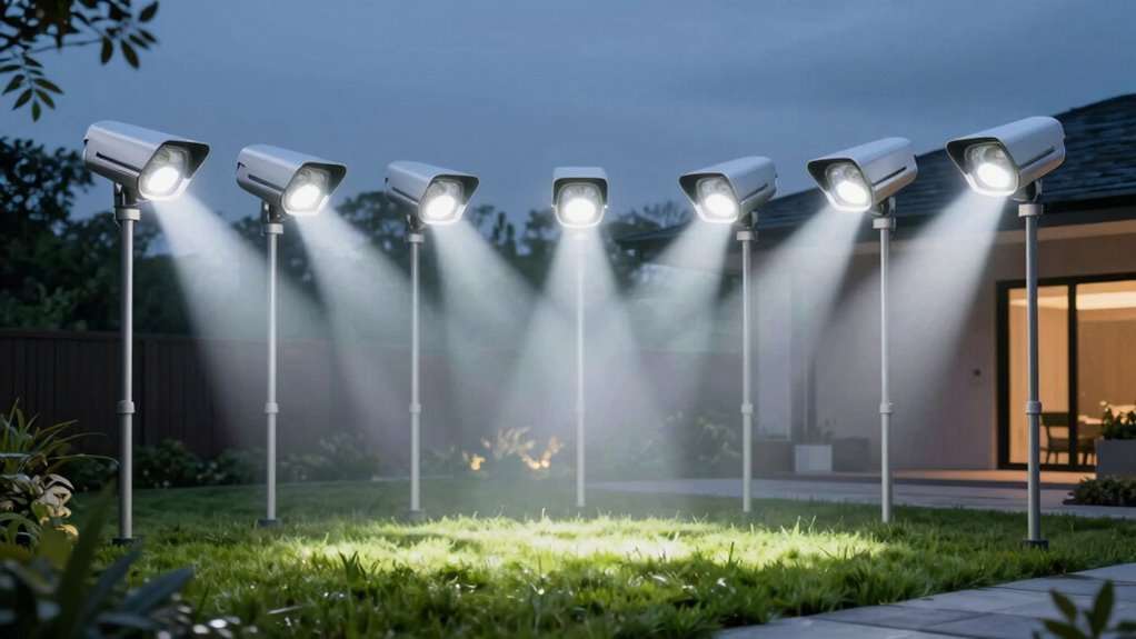 Night vision capabilities play a significant role in guaranteeing your security camera performs well after dark. I look for cameras with effective night vision reaching at least 100 feet, so I get clear footage even in low-light conditions. Many models use infrared technology for black-and-white images, but I prefer those with color night vision, especially when combined with supplemental lighting. Bright floodlights, often over 1800 lumens, improve color night vision by illuminating the scene. Auto-focus lenses and high-resolution sensors ensure sharp, detailed images, even in near-dark environments. Additionally, adjustable lighting modes and brightness settings give me control over visibility, allowing me to customize nighttime performance based on my security needs. Reliable night vision is essential for all-encompassing coverage after sunset.