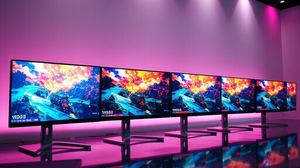 When evaluating 4K gaming monitors with 144Hz refresh rates, color accuracy and HDR support substantially impact visual quality. High color accuracy, achieved through wide color gamuts like 100% or 120% sRGB, ensures vibrant, precise visuals that bring games to life. HDR support, such as HDR400 or HDR600, enhances contrast and color depth, making dark scenes darker and bright scenes more luminous. Monitors with IPS panels usually excel here, providing consistent color from wide viewing angles. Combining HDR and high color accuracy results in lifelike images, essential for immersive gaming and creative work like photo editing. Accurate color reproduction guarantees that details are faithfully displayed, elevating both visual realism and overall experience.