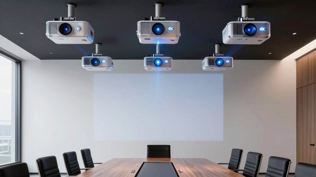 If you’re looking for the best 4K laser projectors under $3000 for conference rooms in 2026, I recommend checking out options like the Ultra HD 4K Google TV Projector, JMGO N1S with smart features, AWOL VISION LTV-2500, NEBULA Cosmos with Android TV, Dangbei MP1 MAX with Dolby Audio, and ViewSonic LS901-4K with HDR. These models deliver bright, sharp images with vibrant colors and flexible setup options. Keep going to discover which one fits your needs best.