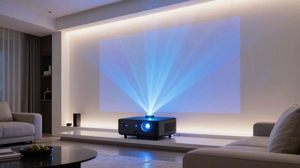 Ambient light is like a relentless tide, constantly washing over your projector’s image. It considerably dims picture quality, washing out colors and reducing contrast. Bright environments make it harder for laser projectors to deliver sharp, vibrant visuals. To get the best experience, I recommend controlling ambient light with curtains or blinds, or choosing a projector with high lumens. This way, your viewing remains crisp and immersive despite the surrounding brightness.
