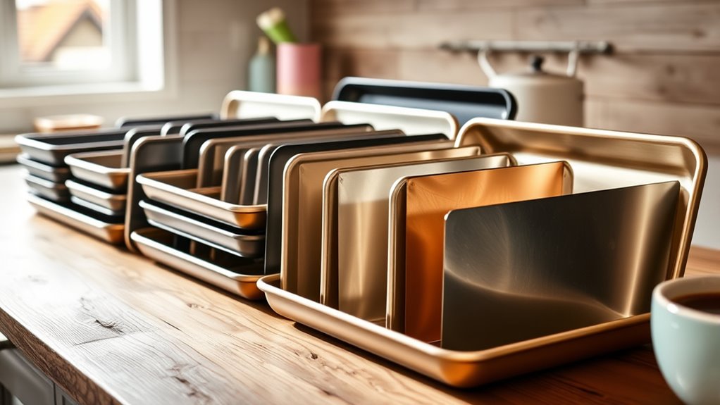 Stainless steel, aluminum, and copper are the best materials for even heat distribution. I find stainless steel great for durability, aluminum excels at spreading heat quickly and evenly, and copper provides superior control with rapid response to temperature changes. These materials help me bake more consistently, whether I’m roasting vegetables or making cookies. Choosing the right material depends on your baking needs, but these options guarantee your baked goods turn out perfectly every time.