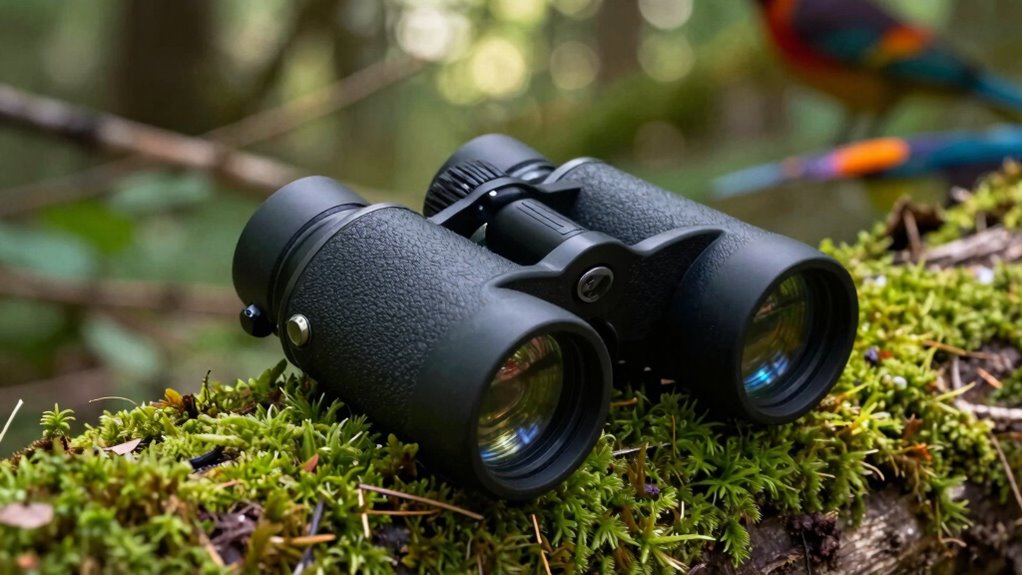 High-quality optical coatings guarantee you see sharp, vivid images, but when bird watching in unpredictable weather, waterproof and fogproof features become just as important. Waterproof binoculars are sealed with O-rings that prevent water from entering, ensuring performance even in rain or humidity. Fogproof models are purged with nitrogen or argon, stopping internal fogging caused by temperature swings. Both features protect the internal optics from moisture, dust, and debris, which can damage the binoculars over time. The waterproof rating, like IPX7, indicates how well they resist water—higher ratings mean better protection against immersion. Fogproof binoculars keep your view clear regardless of weather changes, making them essential for outdoor bird watching in variable conditions. These features extend the lifespan and reliability of your binoculars.