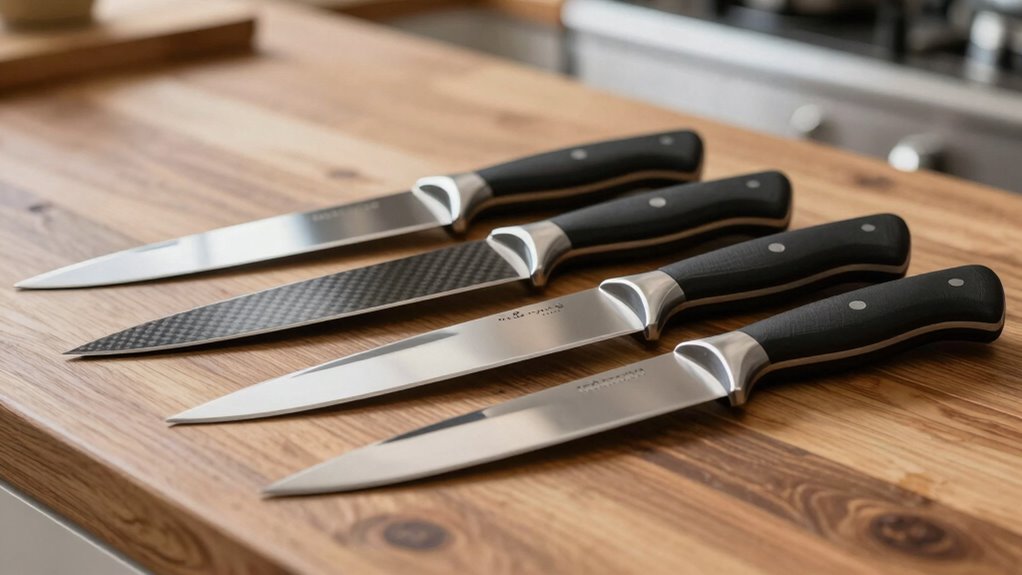 A key factor in selecting a carbon steel knife set is how long the blades stay sharp during use. Carbon steel blades typically hold a fine edge longer than stainless steel because of their higher carbon content and ability to be honed to a sharper angle. The steel’s hardness, often rated between 58-62 on the Rockwell scale, directly impacts how long the edge remains effective. Proper maintenance, like regular honing and correct storage, can considerably extend this sharpness. Additionally, treatments such as nitrogen cooling or vacuum hardening improve durability and help preserve the edge over time. The initial sharpness from manufacturing, achieved through precise forging and honing, also determines how long the knives stay effective during everyday tasks.