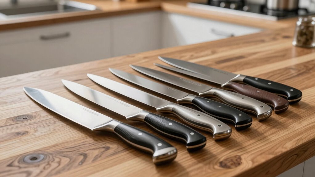 A handle’s comfort and grip are crucial because they directly impact control and ease during extended use. An ergonomic handle design reduces hand fatigue and allows me to work longer without discomfort. Textured or non-slip finger points boost grip security, especially when my hands are wet or greasy. Handles made from durable materials like pakkawood, polypropylene, or soft-touch plastics strike a great balance between comfort and longevity. Proper handle size and shape ensure a natural fit for different hand sizes, giving me better control and precision. Plus, an ergonomic handle minimizes wrist tension and promotes natural wrist alignment, reducing strain and the risk of injury. When choosing a chef knife, prioritize a comfortable, secure grip for safer, more enjoyable cooking.