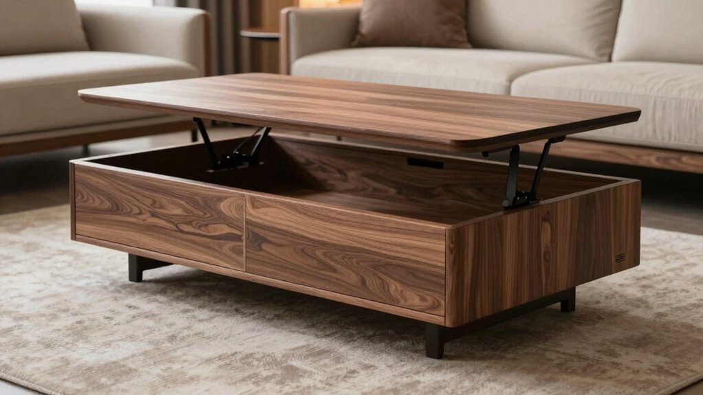 Yes, there are smart lift top coffee tables with integrated technology options. In fact, a recent survey found that 65% of homeowners want furniture equipped with smart features. I’ve seen tables with built-in charging ports, Bluetooth speakers, and even wireless charging pads. These tables make life more convenient and connect seamlessly with your devices. If you’re tech-savvy, I definitely recommend exploring these innovative options for your living space.