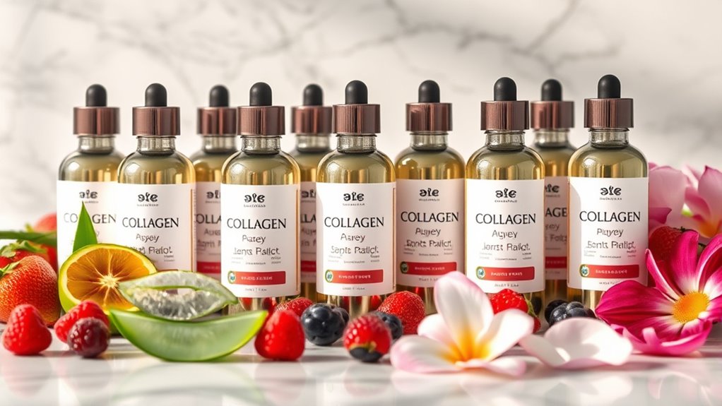 To maximize the benefits of collagen supplements, it’s crucial to take into account their absorption and bioavailability. Hydrolyzed collagen peptides are better absorbed because they’re broken down into smaller amino acid chains, making them easier for your body to utilize. Adding vitamin C boosts collagen synthesis and absorption by supporting key enzymatic processes. Formulations that use natural acid-resistant carriers ensure nutrients reach your small intestine intact, improving bioavailability. Supplements with hyaluronic acid or biotin can enhance hydration and skin penetration, increasing collagen’s effectiveness. Additionally, the form of the supplement matters—powders often offer faster absorption when properly dissolved, compared to capsules or liquids. Paying attention to these factors helps guarantee you get the most out of your collagen supplement.