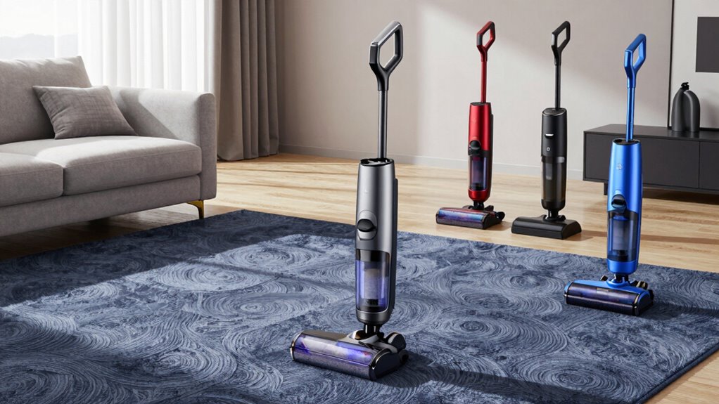 A well-designed brushroll can make a significant difference in how effectively a cordless vacuum cleans carpets. I look for a V-shaped anti-tangle brushroll with guide teeth, which helps prevent hair and fibers from wrapping around it, keeping cleaning consistent. A motorized brushroll with high RPM is essential because it agitates carpet fibers deeply, loosening embedded dirt for thorough removal. Features like spiral or helix anti-entanglement designs also reduce hair tangles, meaning less maintenance and better suction. Adjustable height or bristle stiffness is a plus, allowing me to customize cleaning for different carpet types. Finally, LED lights on the brushroll improve visibility of debris in dark areas, ensuring I don’t miss anything. All these factors combine to optimize carpet cleaning performance.