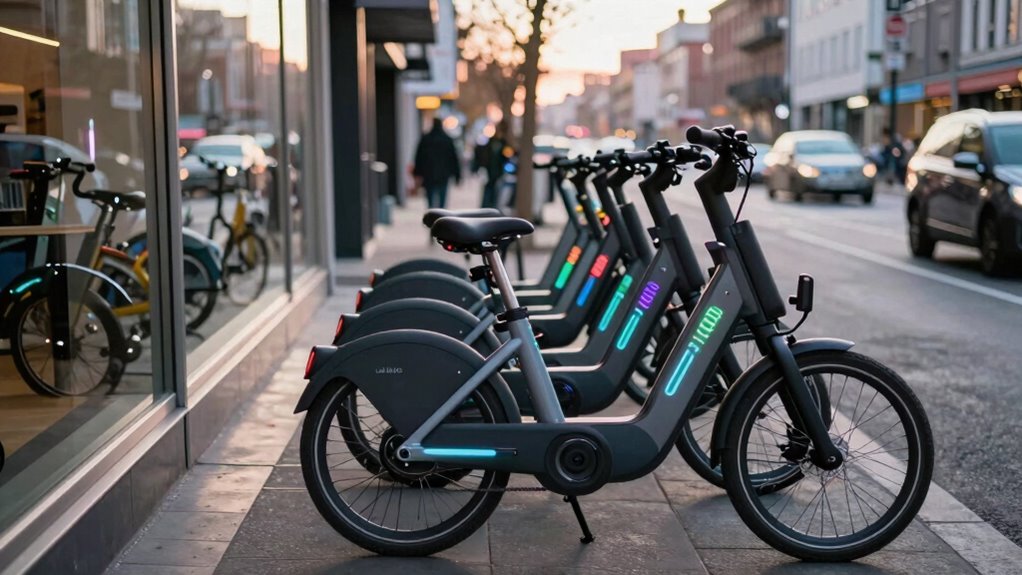 When selecting an electric bike for daily commuting, portability and storage are crucial factors to contemplate, especially if space is limited or you need to transport the bike in a vehicle. Look for bikes with foldable frames or compact designs to make storage easier in small apartments or offices. Removable batteries are a big plus, as they allow for convenient charging and help reduce the bike’s weight for carrying or stowing away. Consider wheel size too; smaller wheels, around 14-20 inches, often offer better foldability and easier storage options. Weighing under 50 pounds, lightweight models are much simpler to carry without assistance. Additionally, features like carrying handles or built-in storage compartments can considerably enhance portability and ease of transport.