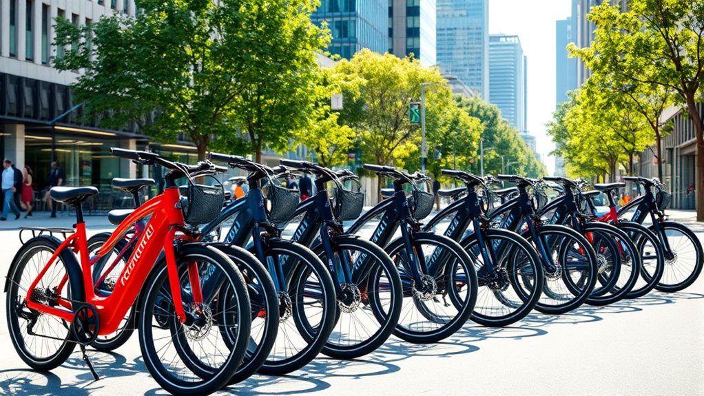 Adding the right features and accessories can substantially enhance your riding experience and overall convenience. Safety features like headlights, taillights, and horns boost visibility and alert others to your presence, especially during night rides. Practical accessories such as rear racks, fenders, and phone holders make daily commuting easier by carrying essentials and protecting you from splashes. Some bikes come equipped with digital LCD displays that show real-time speed, battery life, and mileage, helping you manage your ride better. Ensuring your bike has safety certifications like UL 2849 and UL 2271 guarantees it meets safety standards for electrical safety and fire resistance. Foldable designs and removable batteries add portability and flexibility, making storage and charging more convenient for on-the-go riders.