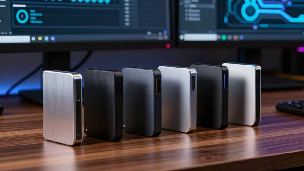 Durability and resistance are key considerations alongside transfer speeds when selecting an external SSD 8TB. I look for drives with IP65 or higher ratings to guarantee protection against dust and water, especially if I plan to use them outdoors. Drop resistance of at least 2 meters (6.6 feet) is essential for rugged environments, and a sturdy casing made from zinc alloy or reinforced silicone can make a big difference in impact resistance. Devices with military-grade MIL-STD ratings give me confidence in their ability to withstand harsh conditions. Additionally, thermal management features like heat dissipation shells prevent overheating during extended use, helping maintain performance and longevity. Prioritizing durability ensures my data stays safe, no matter where I take the drive.