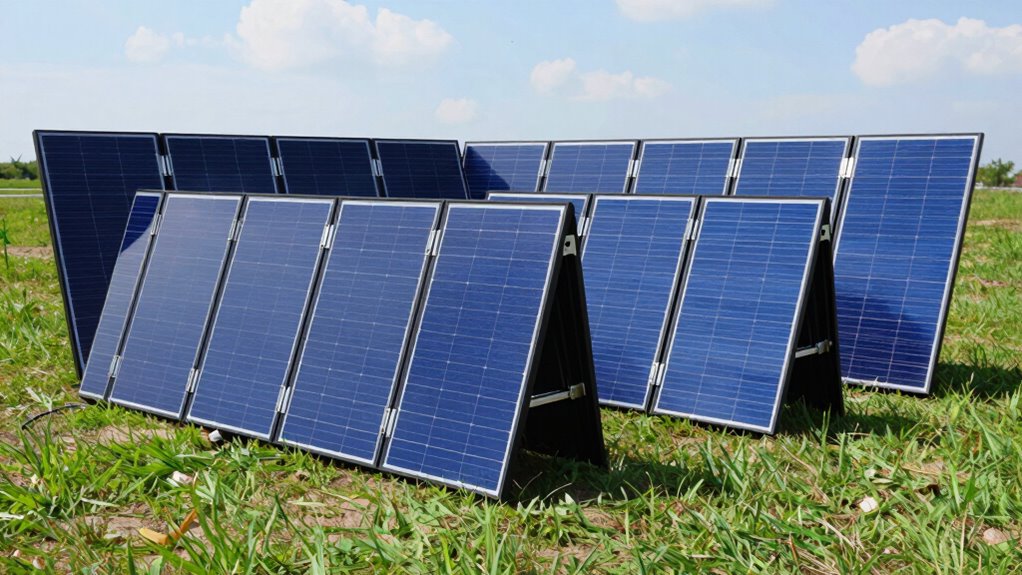 You might think foldable panels are useless in cloudy weather, but surprisingly, they still generate power—just not as much. I’ve found they perform reasonably well in low-light conditions, thanks to modern tech that captures diffuse sunlight. Of course, don’t expect full sunlight levels; instead, they’re perfect for backup or occasional use in overcast skies. So, yes, they do work, even if you’re not basking in bright sunshine.
