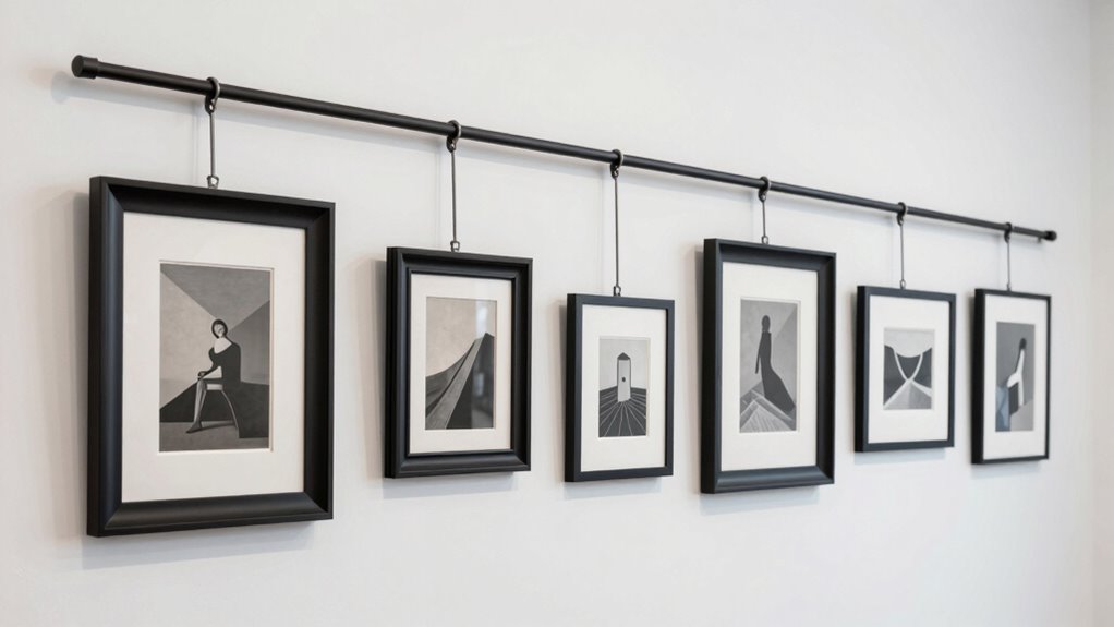 Customization features are essential to tailoring a gallery hanging rail system to fit your specific space and aesthetic needs. Cut-to-size rails let you personalize wall coverage precisely, ensuring a clean, professional look. Paintable surfaces allow you to match the system with your interior decor, creating a seamless appearance. Adjustable hooks and cords offer flexible positioning and make rearranging artwork effortless without damaging walls. Modular components like connectors and end caps enable easy extension and full circuit installation around your walls. Additionally, compatibility with various wall types and hardware options means you can adapt the system to different environments and mounting requirements. These customization options ensure your gallery wall remains versatile, functional, and visually cohesive over time.