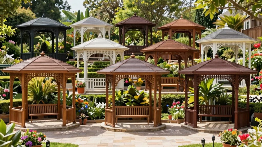 The best materials for durability and weather resistance are treated cedar, vinyl, and powder-coated aluminum. I recommend treated cedar for its natural beauty and strength, while vinyl requires minimal maintenance and resists moisture and pests. Powder-coated aluminum is lightweight, highly durable, and withstands harsh weather conditions. These options guarantee your gazebo pergola stays looking great and remains sturdy over time, no matter what the weather throws at it.