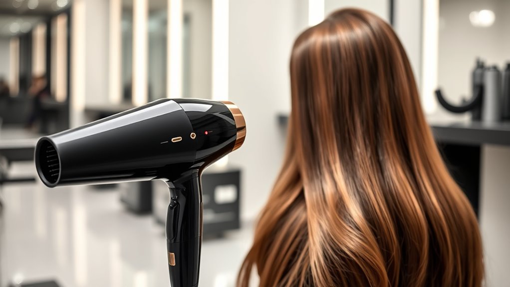 Choosing an ionic hair dryer involves considering how effectively it emits negative ions, as this directly impacts its ability to reduce frizz and enhance shine. The more negative ions it produces—often measured in the hundreds of millions or billions per use—the better it neutralizes positive ions that cause static. This results in smoother, shinier hair while locking in moisture, which prevents dryness and damage. Higher ion output generally correlates with improved frizz control and healthier-looking hair. However, the actual benefits depend on proper usage and consistent ion emission. Some models excel by generating vast amounts of negative ions, ensuring faster drying times and a more polished finish. When selecting a dryer, pay close attention to its ion-emission capabilities to maximize hair health and styling results.