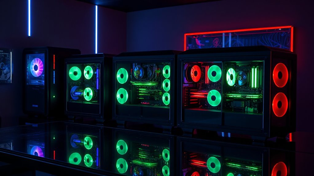 Cooling solutions among top prebuilt gaming desktops vary substantially to optimize performance and noise levels. Many use advanced air cooling with high-quality fans, while others incorporate custom liquid cooling loops for superior heat dissipation. Some systems blend both methods for a balance of efficiency and quiet operation. I find that liquid cooling often provides better thermal management, especially during intense gaming sessions, but it can be more complex to maintain.