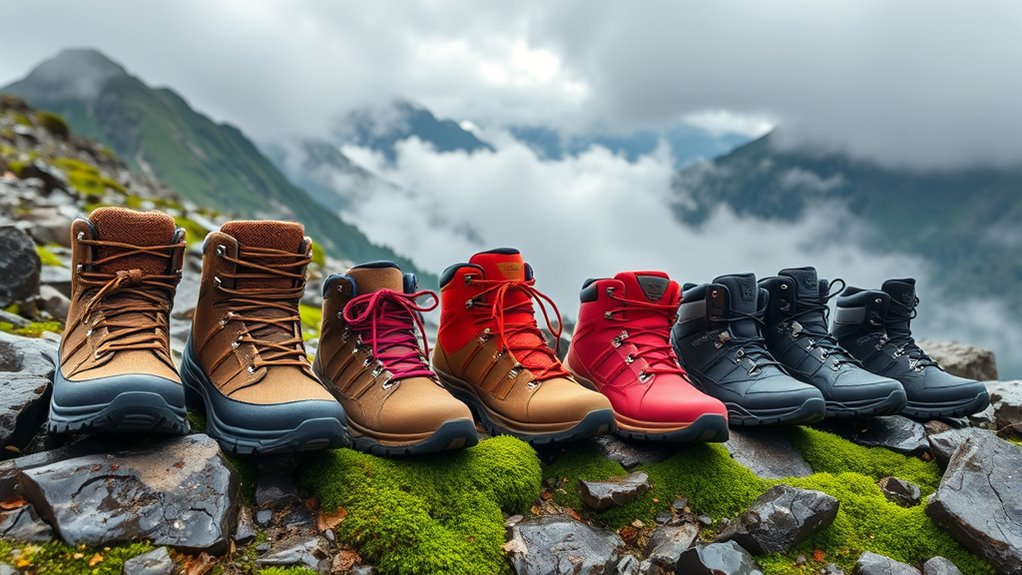 To stay secure on rugged trails, you need hiking boots with excellent traction and grip, especially in wet or muddy conditions. I look for boots with outsole patterns featuring multi-directional lugs, which help keep me stable on uneven terrain. Deep-tread rubber soles boost slip resistance, making me confident on slick surfaces. The material and design of the outsole matter too—softer rubber offers better traction but wears faster, so I balance durability with grip. Traction varies by terrain; aggressive lugs are essential for rocky trails, while flatter soles work well on smoother paths. Proper tread depth and pattern design are vital for preventing slips during steep ascents or descents. Good grip ensures safety and control, no matter where my adventures take me.