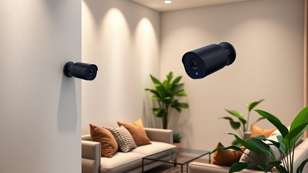 Wireless security cameras handle data privacy and encryption by using strong protocols like AES encryption, which protects footage from unauthorized access. They often employ secure Wi-Fi connections, frequent firmware updates, and two-factor authentication to keep data safe. I make sure to choose cameras with reputable security features, regularly update their software, and change default passwords. This way, I can trust my system to keep my home secure and private.